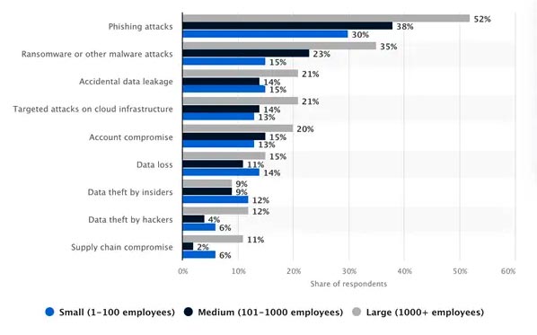 Research conducted by Ermetic and IDC reported that about 80% of businesses surveyed had witnessed at least one cloud data breach in the last 18 months, and 43% of organisations have had more than ten cloud breaches. According to another report published by Statista, 52 percent of global respondents from large organisations and 30-38 percent of small and medium-sized enterprises experienced phishing attacks in terms of cloud security incidents. On the other hand, larger organisations reported being less prone to insider data theft than smaller enterprises.